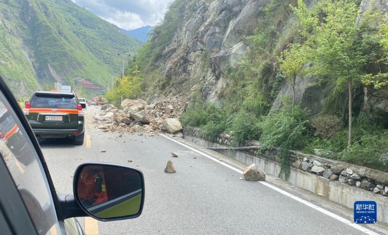 山石掉落在四川省甘孜州瀘定縣冷磧鎮(zhèn)附近的道路上(9月5日攝)。