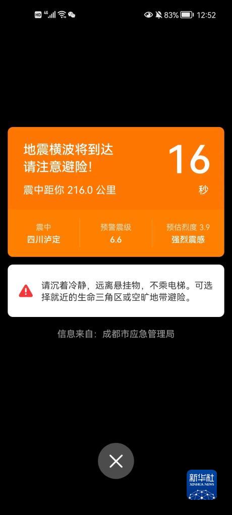 這是成都市民手機(jī)接收到的地震預(yù)警截圖(9月5日攝)。