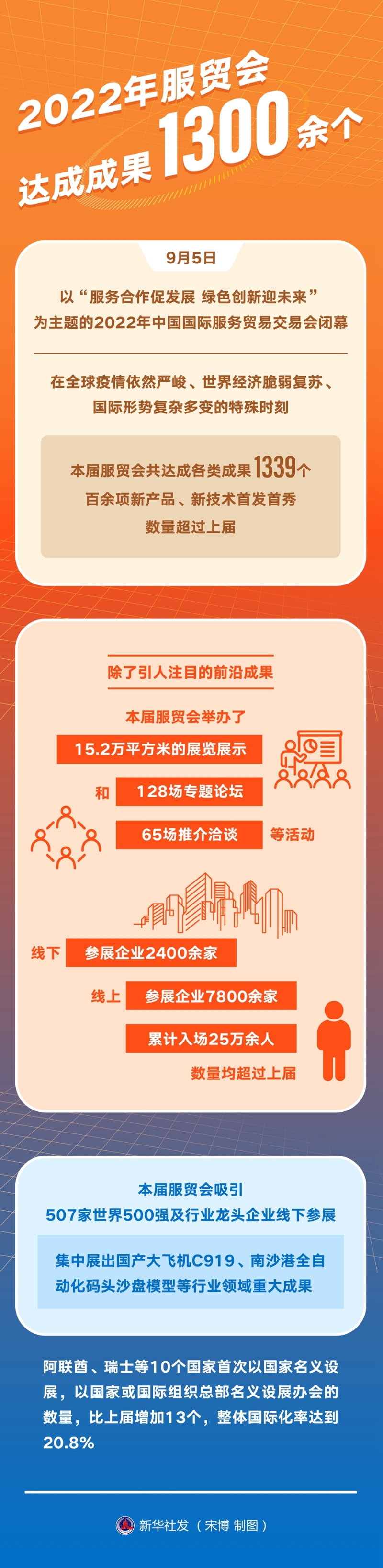 新華社北京9月5日電(記者吉寧)9月5日,以“服務(wù)合作促發(fā)展 綠色創(chuàng)新迎未來(lái)”為主題的2022年中國(guó)國(guó)際服務(wù)貿(mào)易交易會(huì)閉幕。在全球疫情依然嚴(yán)峻、世界經(jīng)濟(jì)脆弱復(fù)蘇、國(guó)際形勢(shì)復(fù)雜多變的特殊時(shí)刻,本屆服貿(mào)會(huì)共達(dá)成各類成果1339個(gè),百余項(xiàng)新產(chǎn)品、新技術(shù)首發(fā)首秀,數(shù)量超過(guò)上屆。