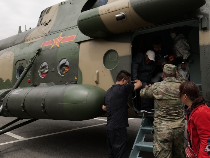 9月6日,西部戰(zhàn)區(qū)空軍某部緊急出動直升機(jī)在瀘定縣轉(zhuǎn)移群眾。新華社發(fā)(胡建軍 攝)