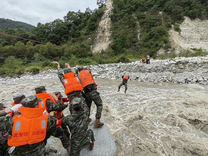 9月6日,武警四川總隊甘孜支隊救援官兵在瀘定縣磨西鎮(zhèn)通過繩索前往河對岸,救助被困群眾。 新華社發(fā)(張文軒 攝)