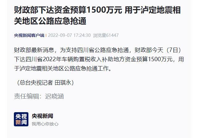 財政部最新消息,為支持四川省公路應急搶通,財政部今天(7日)下達四川省2022年車輛購置稅收入補助地方資金預算1500萬元,用于瀘定地震相關地區(qū)公路應急搶通工作。