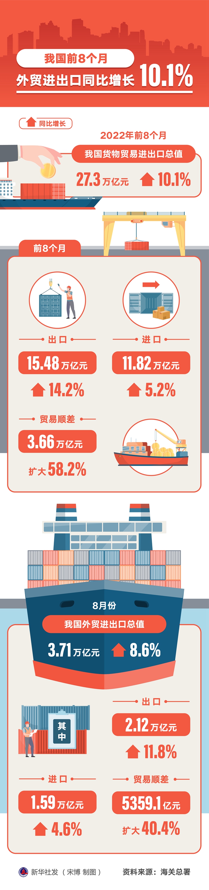 新華社北京9月7日電(記者鄒多為)海關(guān)總署7日發(fā)布數(shù)據(jù),今年前8個(gè)月,我國貨物貿(mào)易進(jìn)出口總值27.3萬億元,同比增長10.1%。