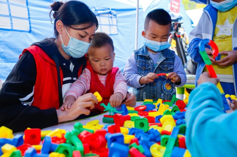 9月7日,在四川省甘孜州瀘定縣磨西鎮(zhèn)地震救災(zāi)安置點(diǎn),志愿者陪伴孩子們?cè)谇嗲鄡和瘶?lè)園玩耍。新華社記者 沈伯韓 攝
