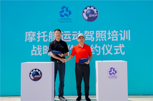 2022年9月1日,雙方在在BRP騎行學(xué)院教練、優(yōu)秀學(xué)員及媒體共同見證下于山東煙臺完成戰(zhàn)略合作簽約儀式?;顒赢?dāng)日,國家體育總局水上運動中心副主任陳春新與龐巴迪(BRP)中國銷售總監(jiān)宋人杰簽署協(xié)議。在簽約儀式的現(xiàn)場,陳春新副主任還為BRP騎行學(xué)院教練頒發(fā)首批(初級)摩托艇技能教練員證書,并為通過測試的學(xué)員代表們頒發(fā)摩托艇駕駛執(zhí)照。
