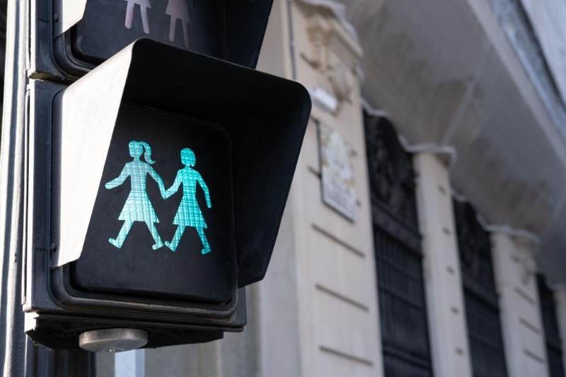 這是2021年3月6日在西班牙馬德里街頭拍攝的行人信號(hào)燈。西班牙馬德里2017年耗資22000歐元,在72處路口更換了288個(gè)行人信號(hào)燈。其中有穿裙裝、手牽手等不同的形象,用以號(hào)召性別平等。新華社記者孟鼎博 攝