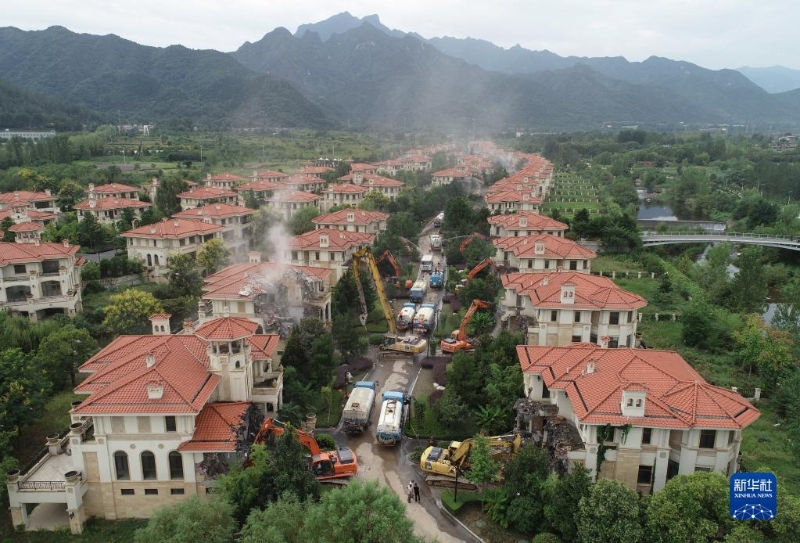 大型機械在陜西省西安市長安區(qū)秦嶺違建別墅群“群賢別業(yè)”內進行拆除工作(2018年9月6日攝,無人機照片)。新華社記者 邵瑞 攝