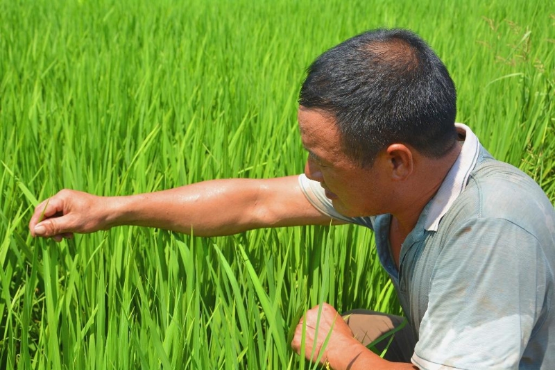 江西信豐縣種糧大戶張四生蹲在田頭查看水稻恢復(fù)情況。(受訪者供圖)