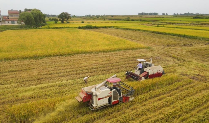 湖北襄陽(yáng)市襄州區(qū)黃龍鎮(zhèn)黃溝村的千畝稻田陸續(xù)開(kāi)始收割。(受訪者供圖)