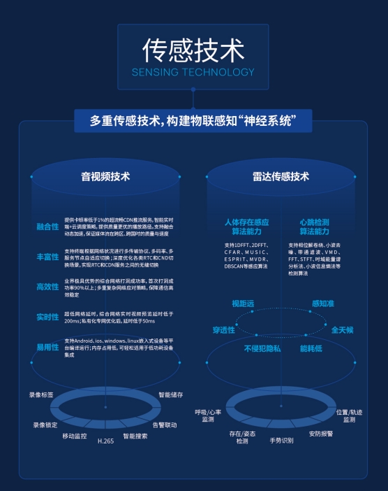 視覺與雷達(dá)傳感技術(shù)作為萬佳安的核心技術(shù)之一,是海量數(shù)據(jù)的接收和傳遞入口。主要有實時音視頻技術(shù)及毫米波雷達(dá)傳感技術(shù)。音視頻技術(shù)具有融合性、豐富性、高效性、實時性、易用性五大特點,可提供卡頓率低于1%的超流暢CDN推流服務(wù),超低網(wǎng)絡(luò)延時,綜合網(wǎng)絡(luò)實時視頻預(yù)覽延時低于200ms,私有化專網(wǎng)優(yōu)化后,延時低于50ms,提供質(zhì)量更優(yōu)的音視頻播放體驗。雷達(dá)傳感技術(shù)具有視距遠(yuǎn)、感知準(zhǔn)、穿透性強、全天候、不侵犯隱私等優(yōu)勢,擁有人體存在感應(yīng)算法能力以及心跳檢測算法能力,實現(xiàn)人體存在感知、人體姿態(tài)檢測、位置軌跡監(jiān)測、呼吸心跳檢測等功能。