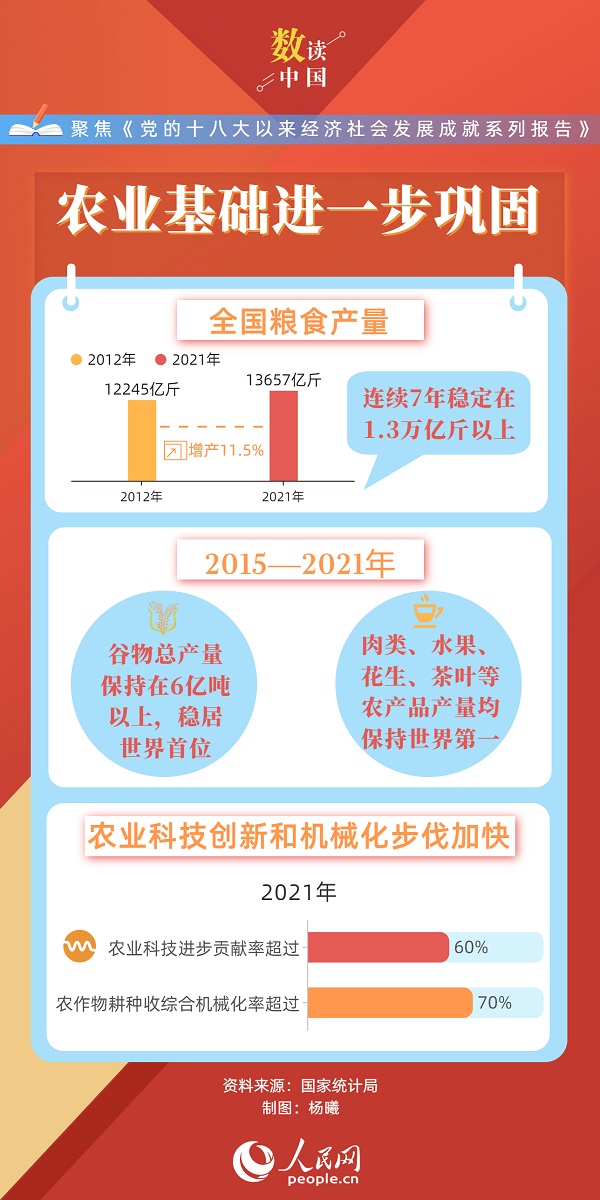 人民網(wǎng)北京9月14日電 (記者楊曦)國家統(tǒng)計局14日發(fā)布《黨的十八大以來經(jīng)濟社會發(fā)展成就系列報告之二——農(nóng)業(yè)發(fā)展成就顯著 鄉(xiāng)村美麗宜業(yè)宜居》(以下簡稱報告)。報告從我國農(nóng)業(yè)經(jīng)濟持續(xù)穩(wěn)定增長、主要農(nóng)產(chǎn)品供應充裕、農(nóng)業(yè)基礎設施建設成就突出、農(nóng)村面貌和人居環(huán)境顯著改善等多個方面總結了十年來農(nóng)業(yè)發(fā)展的顯著成就。
