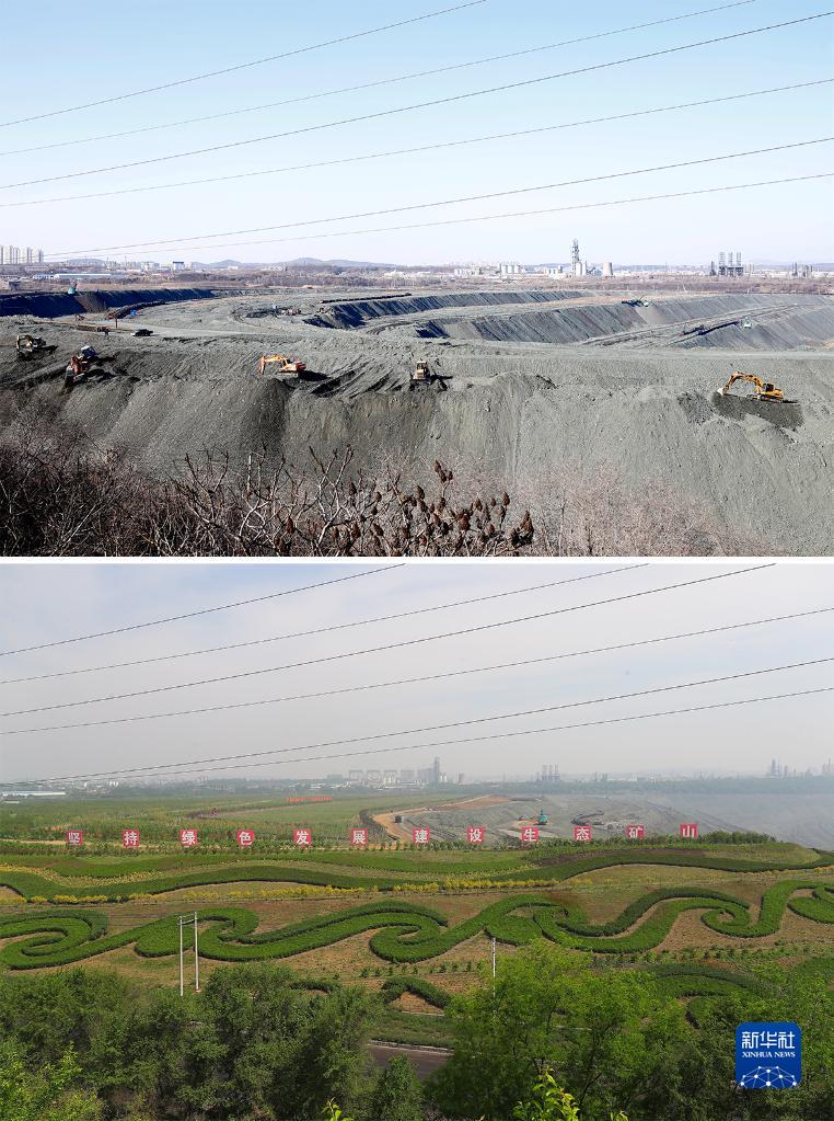 這是一張拼版照片:上圖為遼寧省撫順市西露天礦部分區(qū)域生態(tài)恢復(fù)前的場(chǎng)景(2019年3月6日攝,資料照片);下圖為2022年6月2日拍攝的遼寧省撫順市西露天礦部分區(qū)域生態(tài)恢復(fù)后的場(chǎng)景(新華社記者楊青攝,無(wú)人機(jī)照片)。新華社發(fā)
