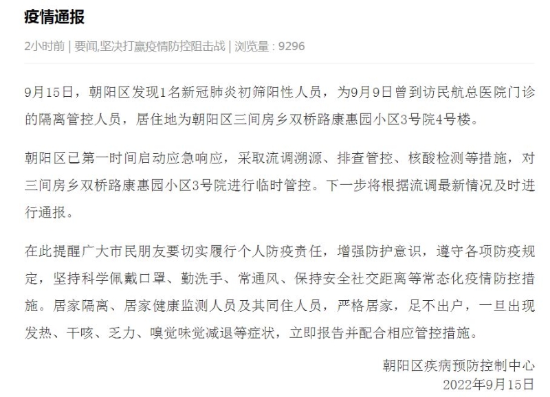 9月15日,朝陽區(qū)發(fā)現(xiàn)1名新冠肺炎初篩陽性人員,為9月9日曾到訪民航總醫(yī)院門診的隔離管控人員,居住地為朝陽區(qū)三間房鄉(xiāng)雙橋路康惠園小區(qū)3號(hào)院4號(hào)樓。