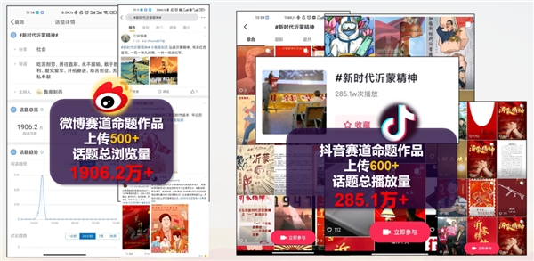 賽事活動(dòng)歷時(shí)六個(gè)月,最終收獲常規(guī)賽道8000+組創(chuàng)意作品,更有120位校園大使為“新時(shí)代沂蒙精神”傾情代言,抖音、微博賽道#新時(shí)代沂蒙精神#話題流量持續(xù)高漲,平面海報(bào)、短視頻、社交推文……一個(gè)個(gè)奔騰跳躍的流量“黑馬”,掀起關(guān)于學(xué)習(xí)沂蒙精神的“打卡熱”。