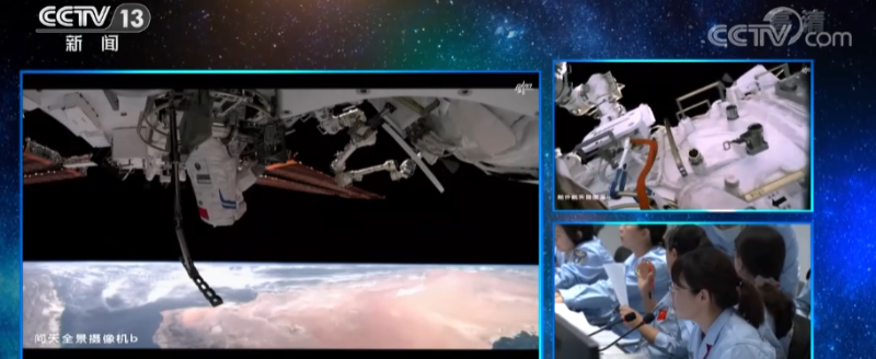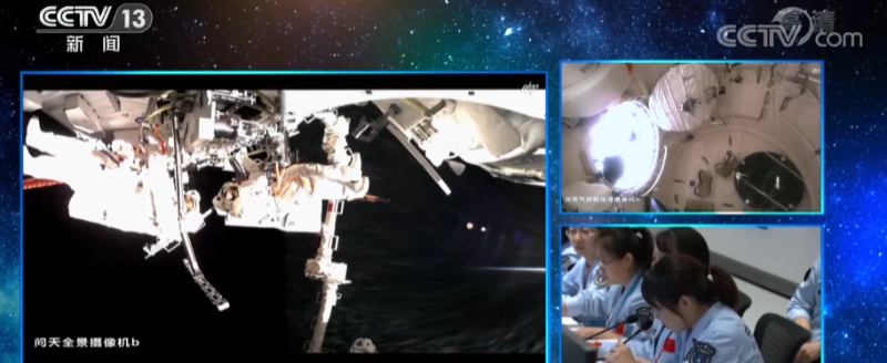 航天員陳冬和蔡旭哲在艙外操作時,航天員劉洋在核心艙內(nèi)對艙外兩名航天員進行支持。完成全部既定任務(wù)后,艙外兩名航天員順利回到氣閘艙出艙口。
