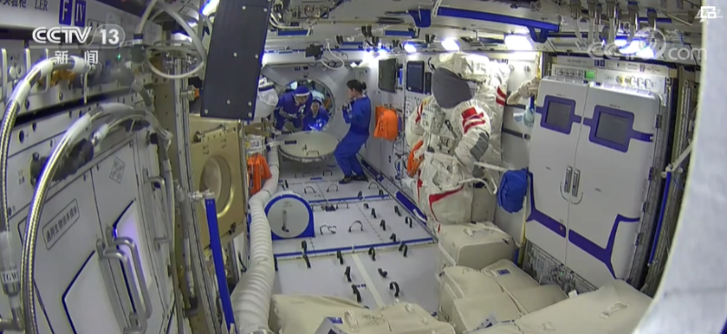 17時47分,航天員陳冬和蔡旭哲關(guān)閉出艙艙門檢漏并出艙外服,在航天員劉洋引導(dǎo)下完成氣閘艙負(fù)壓。此次任務(wù)僅用時約5個小時。