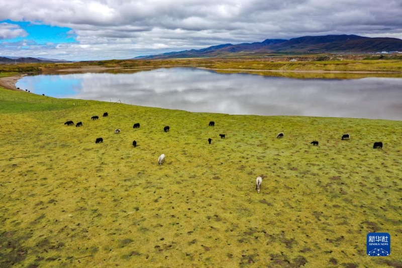牛群和馬在黃河瑪曲段干流沿岸的一處草地上吃草(9月17日攝,無人機(jī)照片)?,斍h在2019年就實(shí)現(xiàn)了草畜平衡。