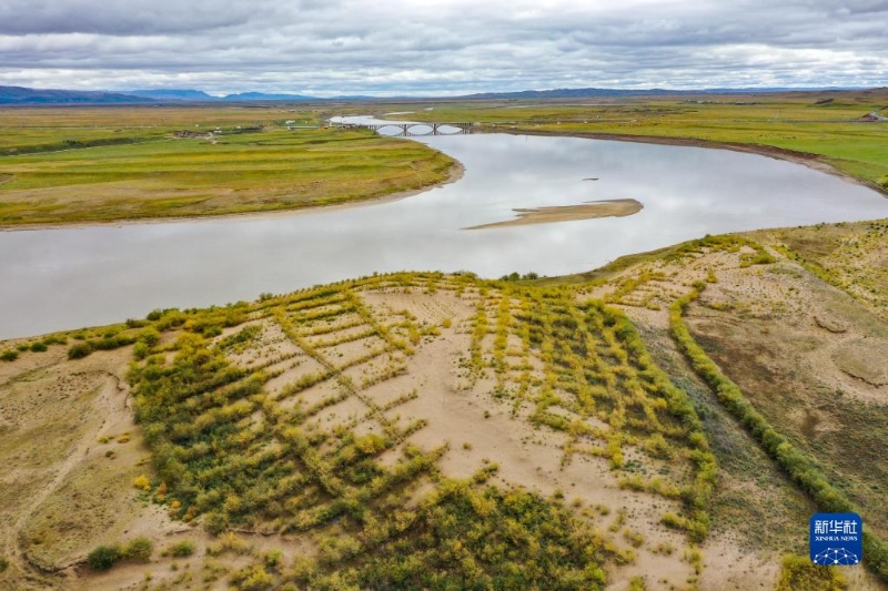 這是黃河瑪曲段干流沿岸一處流動(dòng)沙丘修復(fù)治理工程(9月17日攝,無人機(jī)照片)?! ?/p>