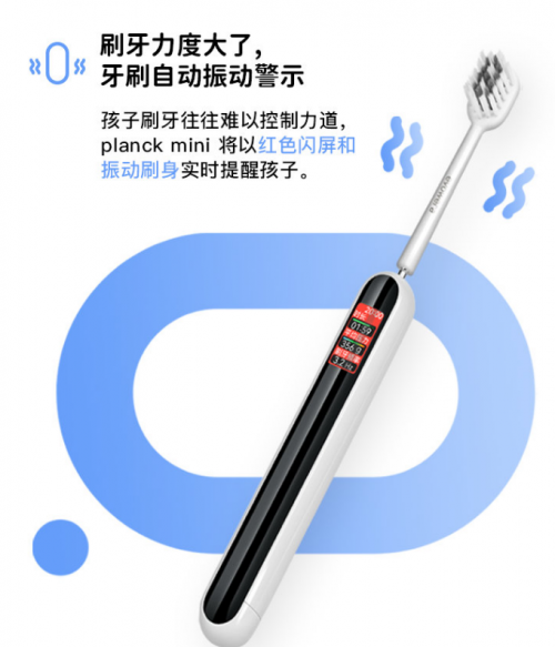 planck mini智能手動牙刷內(nèi)置六軸陀螺儀傳感器,在實時算法的輔助下,不僅能夠判斷刷牙時未覆蓋的區(qū)域,還可以通過手柄上的0.96寸全彩屏幕,用更為直觀的12分區(qū)口腔全域提示,提醒用戶及時補刷;與此同時,planck mini智能手動牙刷還內(nèi)置有高精度刷牙壓力檢測傳感器,配合振動電機,在用戶刷牙力度過大時,就會通過紅色閃屏和振動刷身的方式,提醒用戶及時地調(diào)節(jié)自己的刷牙力度,呵護口腔健康。