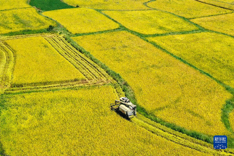 8月11日,在江西省宜春市上高縣錦江鎮(zhèn)垴上村,農(nóng)民駕駛收割機(jī)收割稻谷。新華社發(fā)(陳旗海 攝)