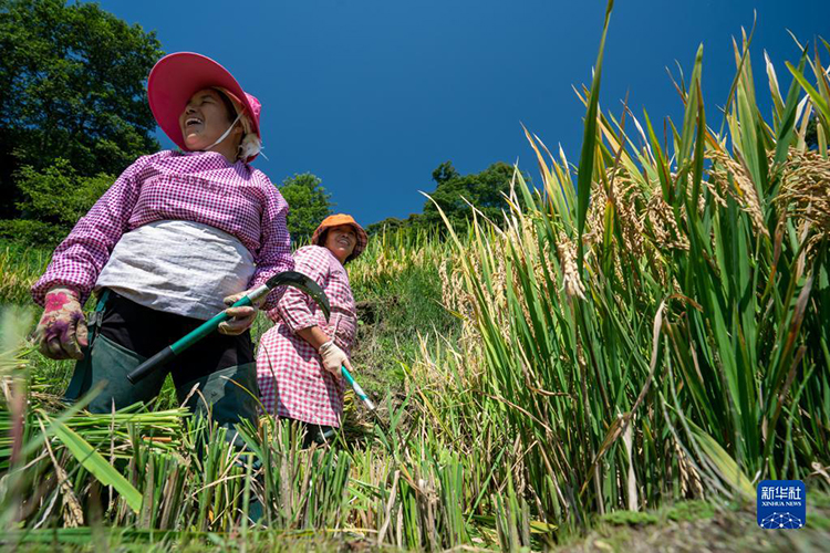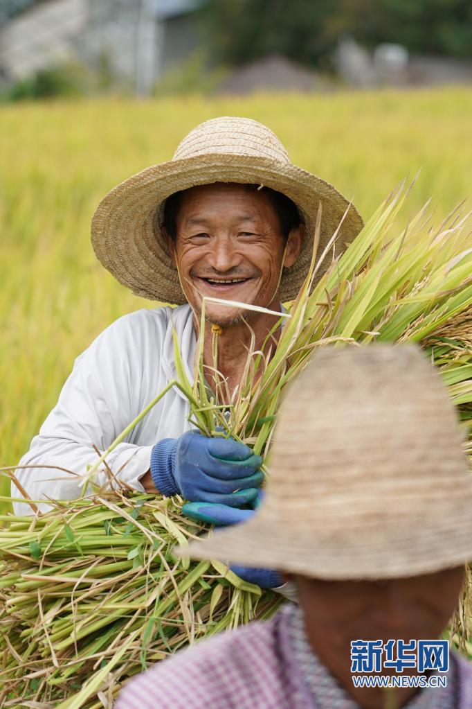 村民在梯田中收割水稻(9月7日攝)。新華社記者 江文耀 攝