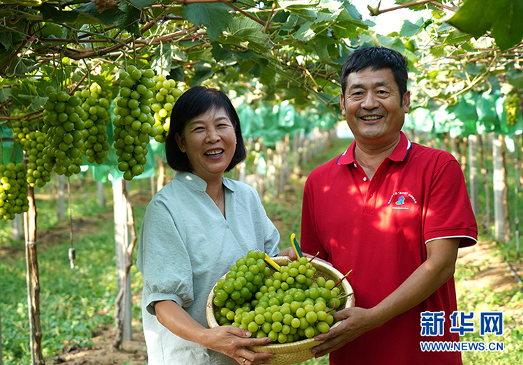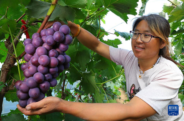 9月6日,在丁家房鎮(zhèn)大蛇山子村,果農(nóng)在大棚里查看葡萄成熟情況。新華社記者 楊青 攝