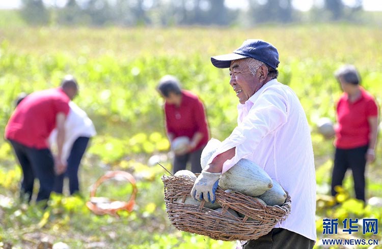 9月11日,呼和浩特市賽罕區(qū)金河鎮(zhèn)大一間房村農(nóng)民在收獲甘龍栗南瓜。新華網(wǎng)發(fā)(王正 攝)