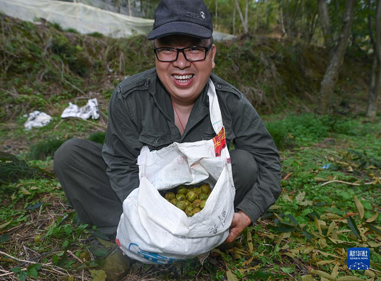 9月7日,在淳安縣臨岐鎮(zhèn)審嶺腳村的山核桃林中,農(nóng)戶魯夢(mèng)進(jìn)展示剛剛采收的山核桃果。新華社記者 徐昱 攝