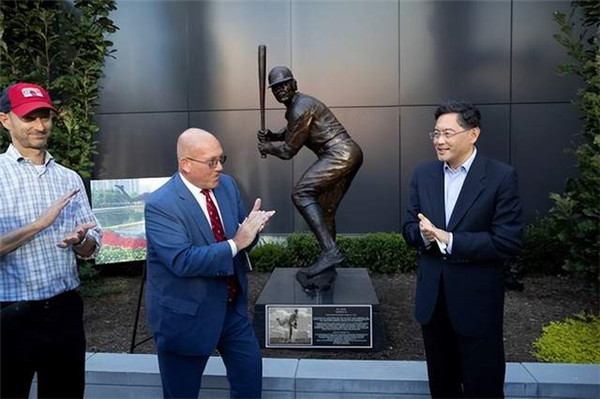 紅雀的球場(chǎng)外,秦剛大使還出席了友城紀(jì)念雕像揭牌儀式。南京的雕像是投球手,圣路易斯的雕像是擊球手。這座擊球手雕像,與2019年圣路易斯贈(zèng)與南京的投球手雕像互為一組。這一“球”,隔空傳遞了友好和熱愛(ài)。秦剛大使發(fā)文說(shuō):“我作為開(kāi)球嘉賓,在圣路易斯紅雀(St. LouisCardinals)和辛辛那提紅人(Cincinnati Reds)的棒球比賽中投出第一球,紀(jì)念南京和圣路易斯建立第一個(gè)中美友好城市43周年。同時(shí),為兩個(gè)城市的第一對(duì)棒球運(yùn)動(dòng)員雕像揭幕?!?/p>