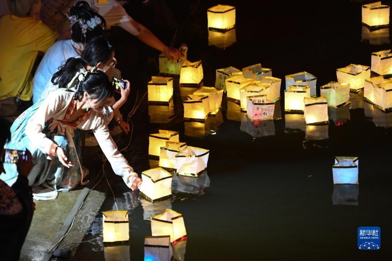 9月24日,游客在杭州宋城景區(qū)放河燈。