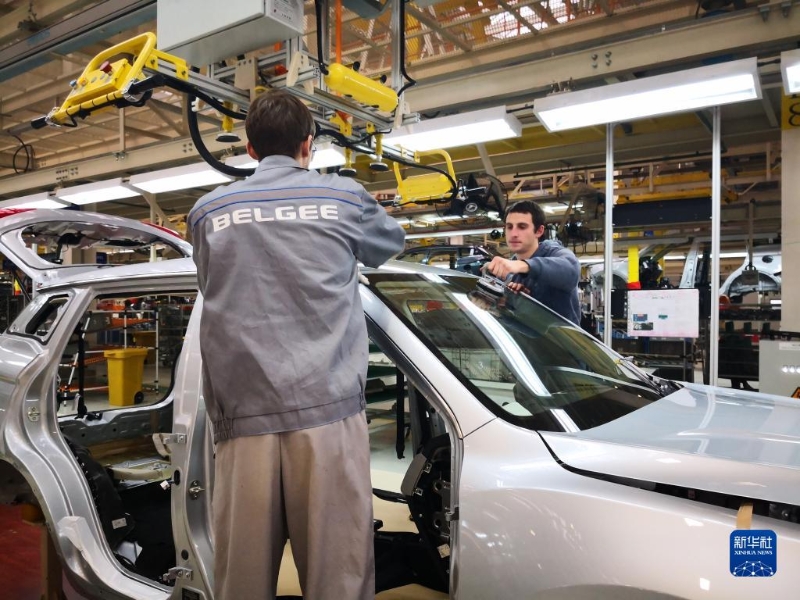 在白俄羅斯首都明斯克東北方向50公里處的白俄羅斯吉利全散件汽車制造廠總裝車間,工人組裝車體(2018年12月1日攝)。新華社記者 張若玄 攝