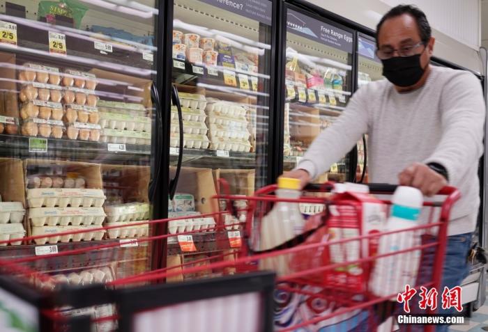 當?shù)貢r間4月5日,一名顧客從美國加州圣馬特奧縣一家超市的雞蛋貨柜前經(jīng)過。 中新社記者 劉關關 攝