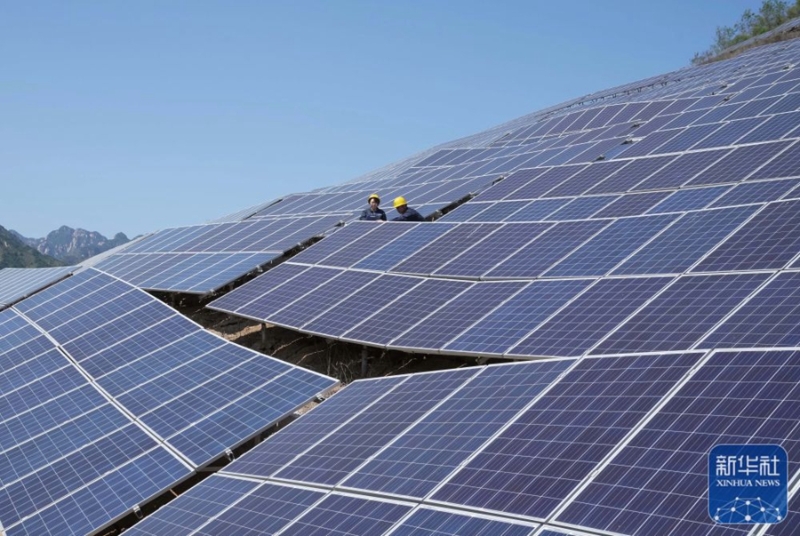 9月24日,國網平山縣供電公司的工人在平山縣營里鄉(xiāng)桃園10千伏儲能站光伏發(fā)電板區(qū)巡查。新華社記者 楊世堯 攝
