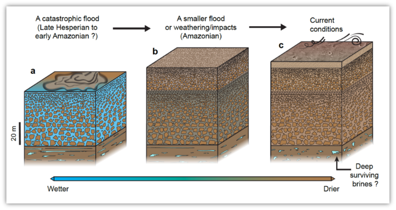 研究人員發(fā)現(xiàn),該區(qū)域數(shù)米厚的火星土壤層之下存在兩套向上變細(xì)的沉積層序:第一套層序位于火星表面以下約10至30米,含有較多石塊,其粒徑隨深度逐漸增大;第二套層序位于火星表面以下約30至80米,其石塊粒徑更大,可達(dá)米級,且分布更為雜亂,反映了更古老、更大規(guī)模的火星表面改造事件。
