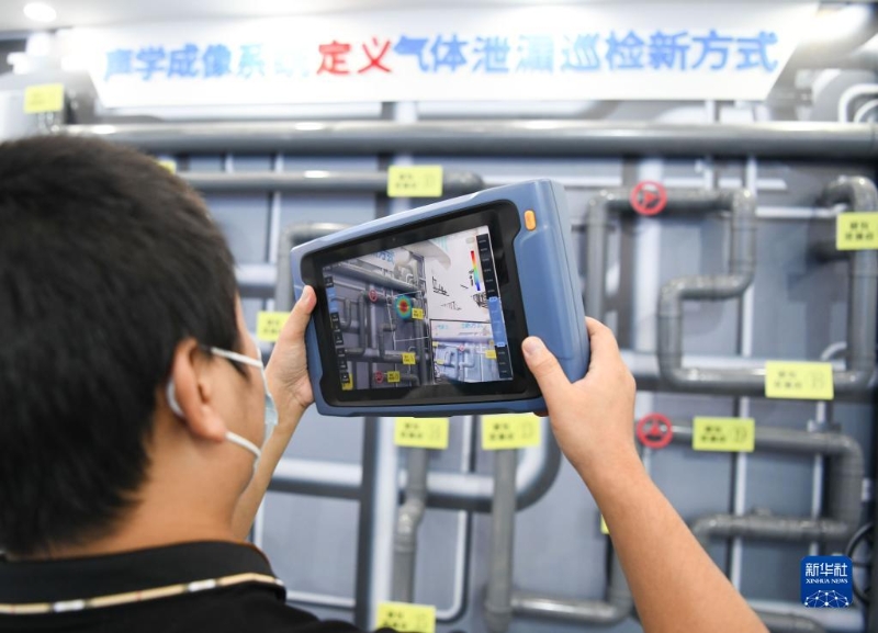 在安徽合肥舉辦的2022世界制造業(yè)大會(huì)上,參展人員在操作一款用于氣體泄漏巡檢的聲學(xué)成像儀(9月22日攝)。新華社記者 張端 攝