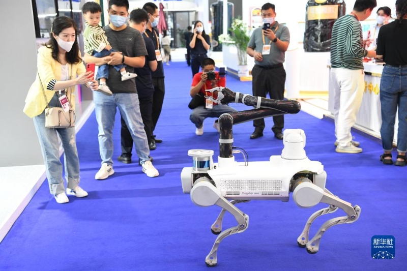 參觀者在安徽合肥舉辦的2022世界制造業(yè)大會(huì)上拍攝展出的一款四足巡檢機(jī)器人(9月20日攝)。新華社記者 張端 攝