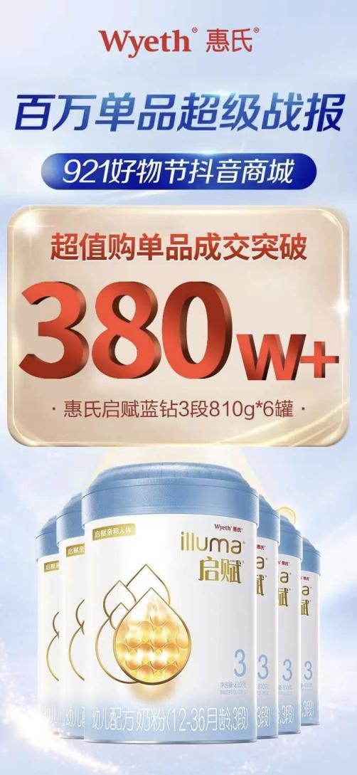 9月抖in親子囤貨節(jié)作為為母嬰商品打造的營(yíng)銷活動(dòng),與超值購(gòu)頻道深度聯(lián)動(dòng),為商家?guī)?lái)銷售增長(zhǎng),培養(yǎng)用戶購(gòu)物心智。抖音電商超值購(gòu)頻道主打大牌心智,平臺(tái)補(bǔ)貼則真實(shí)為消費(fèi)者帶來(lái)實(shí)惠好物,為商家生意帶來(lái)了新的增長(zhǎng)機(jī)會(huì)?;顒?dòng)期間,惠氏啟賦藍(lán)鉆3段奶粉迎來(lái)銷量爆發(fā)增長(zhǎng),單品成交額突破380萬(wàn)+。