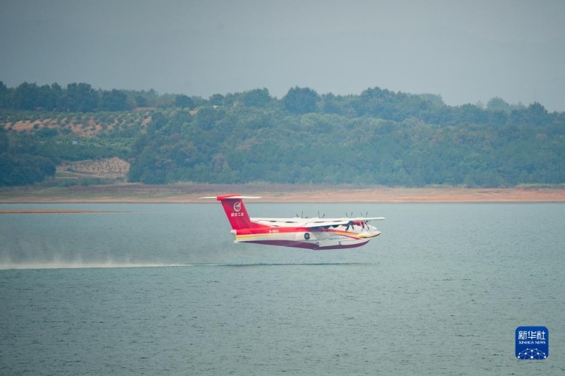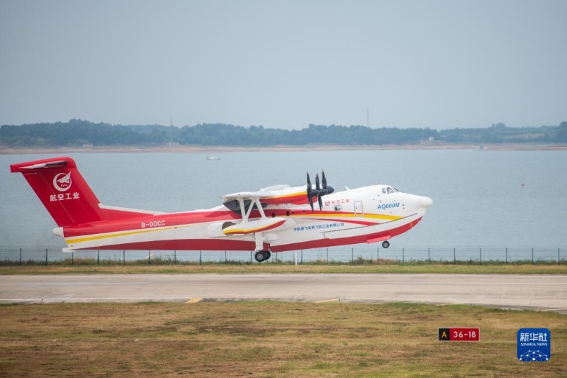當(dāng)日,由我國自主研制的大型水陸兩棲飛機(jī)“鯤龍”AG600M,以全新紅色消防涂裝在湖北省荊門市漳河機(jī)場完成12噸投汲水試驗(yàn)。