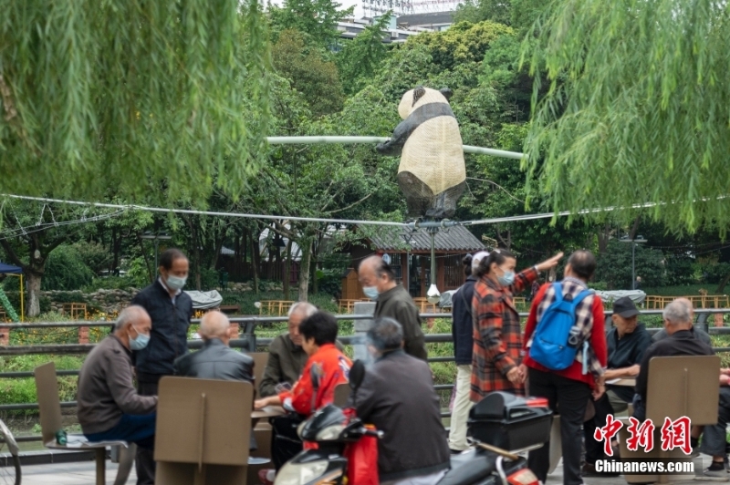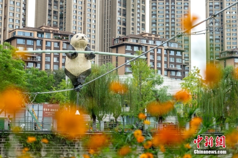 9月27日,府河上走鋼絲的竹編縷空“大熊貓”。近日,一走鋼絲的竹編縷空“大熊貓”在成都現(xiàn)身,橫跨成都府河兩岸,為城市增添一道靚麗景色。 中新社記者 劉忠俊 攝