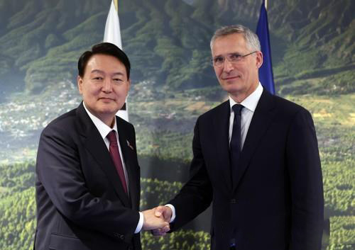 當(dāng)?shù)貢r間6月30日下午,在西班牙馬德里國際會展中心,韓國總統(tǒng)尹錫悅(左)與北約秘書長斯托爾滕貝格進(jìn)行會晤。圖自韓媒