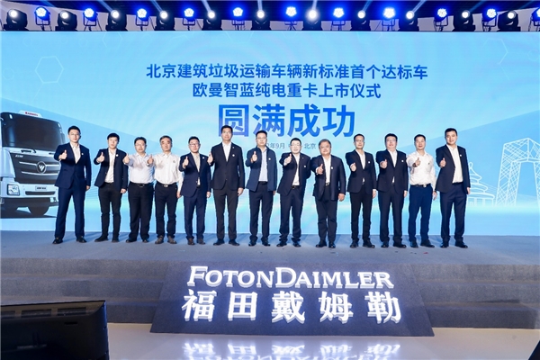 當(dāng)天,北京汽車行業(yè)協(xié)會、福田汽車、福田戴姆勒汽車、合作伙伴及在京主流媒體參加活動,共同見證歐曼智藍(lán)純電重卡上市儀式。