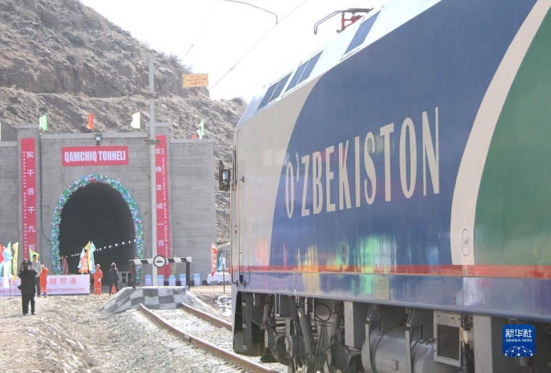 2016年2月27日,一列專列停在烏茲別克斯坦安格連-帕普鐵路卡姆奇克隧道進口。新華社記者 沙達提 攝