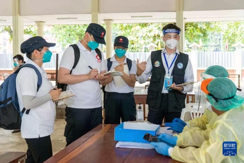 2021年5月7日,中國政府醫(yī)療專家組在老撾首都萬象考察一個新冠病毒采樣點,了解采樣流程、信息采集、密切接觸者判定標(biāo)準(zhǔn)和環(huán)境消毒等情況。新華社發(fā)(中國政府醫(yī)療專家組供圖)
