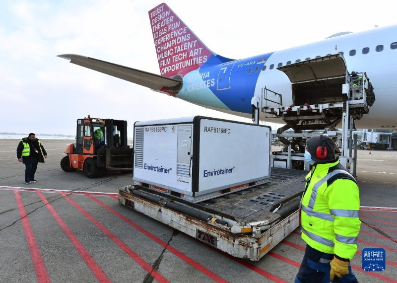 2021年1月16日,在塞爾維亞首都貝爾格萊德,機場工作人員卸載由中國國藥集團生產(chǎn)的新冠疫苗。新華社發(fā)(普雷德拉格·米洛薩夫列維奇攝)