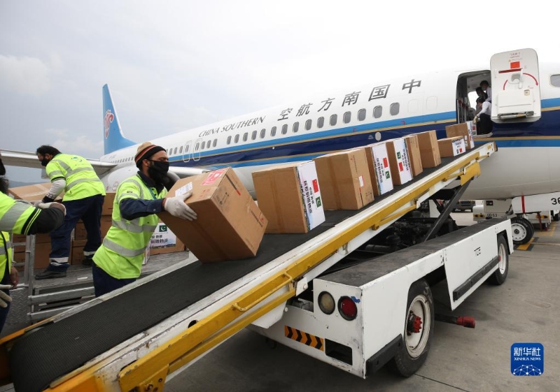 2020年3月28日,在巴基斯坦伊斯蘭堡國際機場,工作人員卸載中國捐贈的醫(yī)療救治物資。新華社記者 劉天 攝