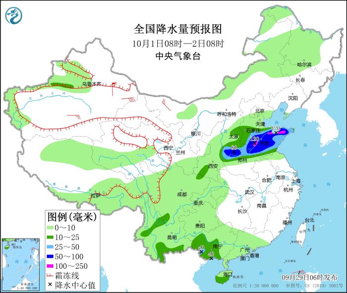 10月1日08時(shí)至2日08時(shí),河北南部、山東、山西南部、河南北部等地部分地區(qū)有大到暴雨,局地大暴雨(100~120毫米);陜西南部、云南南部、廣西中南部、海南島南部等地部分地區(qū)有中到大雨。新疆大部、內(nèi)蒙古西部、甘肅西部等地有4~6級風(fēng),其中,新疆東部部分地區(qū)風(fēng)力8~9級。
