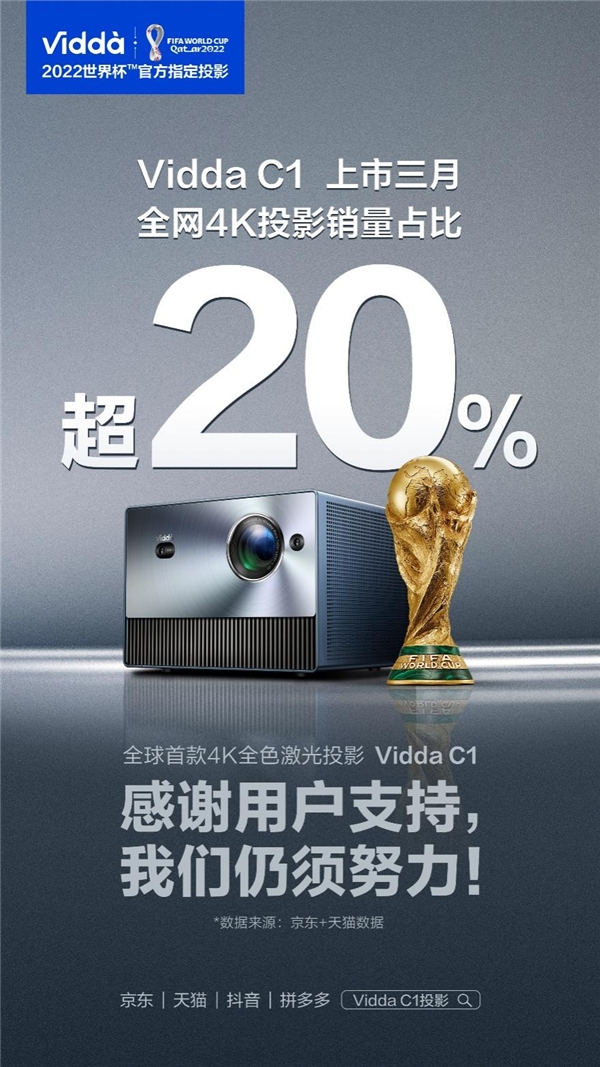 9月27日消息,京東、天貓等電商平臺數據顯示,全球首款4K全色激光投影Vidda C1上市三個月即實現4K投影銷量占比超20%的成績。作為剛剛進入投影市場的“新人”,Vidda C1憑借“萬元內天花板畫質”和堅持標注實測亮度等產品特性,迅速占據了旗艦級家用投影市場的領頭羊地位。
