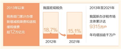 減稅降費,用政府收入的“減法”,換取企業(yè)效益的“加法”和市場活力的“乘法”。數據顯示,2013年至2021年,我國新辦涉稅市場主體累計達9315萬戶,年均增加逾千萬戶;增值稅一般納稅人戶數由2015年底的544萬戶增長至2021年底的1238萬戶。廣大市場主體發(fā)展活力不斷激發(fā),“放水養(yǎng)魚、水多魚多”效果持續(xù)顯現。