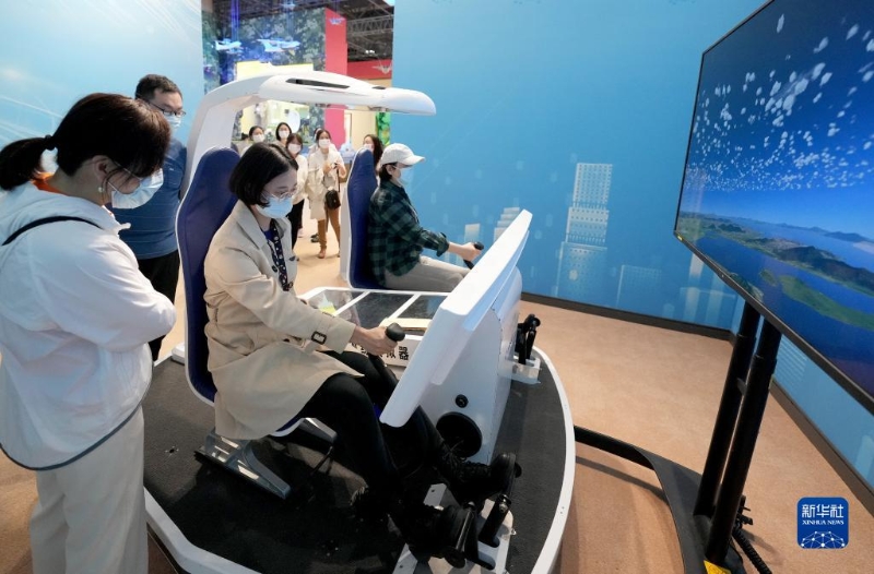 10月7日,觀眾在“奮進新時代”主題成就展上體驗操縱直升機訓(xùn)練模擬器。當(dāng)日是國慶長假的最后一天,大批觀眾來到北京展覽館參觀“奮進新時代”主題成就展。新華社記者 王毓國 攝