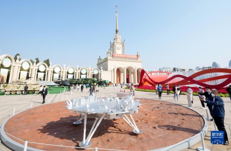 10月7日,觀眾在“奮進新時代”主題成就展上參觀天問一號著陸器模型。當(dāng)日是國慶長假的最后一天,大批觀眾來到北京展覽館參觀“奮進新時代”主題成就展。新華社記者 王毓國 攝